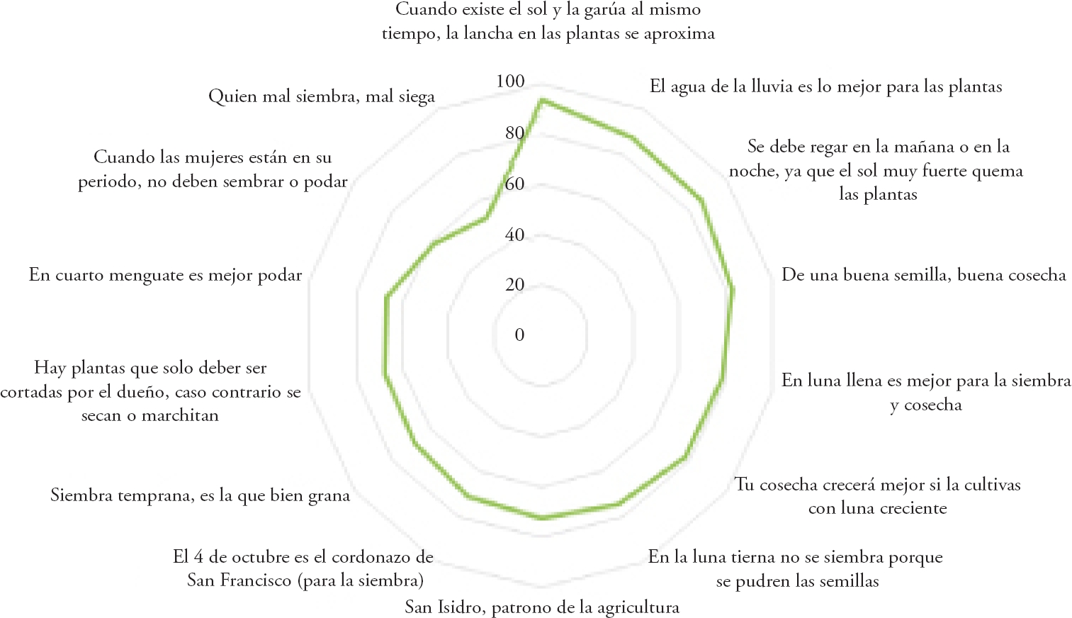 Los dichos referentes a la luna, fueron “la luna llena, es mejor para la siembra y la cosecha” y “la cosecha crecerá mejor, si se la cultiva con luna creciente”, indicando que, en la etapa de luna llena, ellos tratan de cosechar sus productos de hoja; y que sus tallos, puedan ser aprovechados, como los nabos, espárragos, acelgas, cebolla de hoja, apio, etc. Eso les permite que sus cosechas, sean abundantes en comparación con la cosecha en otras fases lunares. Esto concuerda con lo reportado por Tercero y Portillo (2012), en luna llena, la intensidad de la fotosíntesis, es superior en todas las plantas; además, la savia en las plantas, se acumula en los tallos y hojas, motivo por el cual, las hortalizas son de gran tamaño y peso.