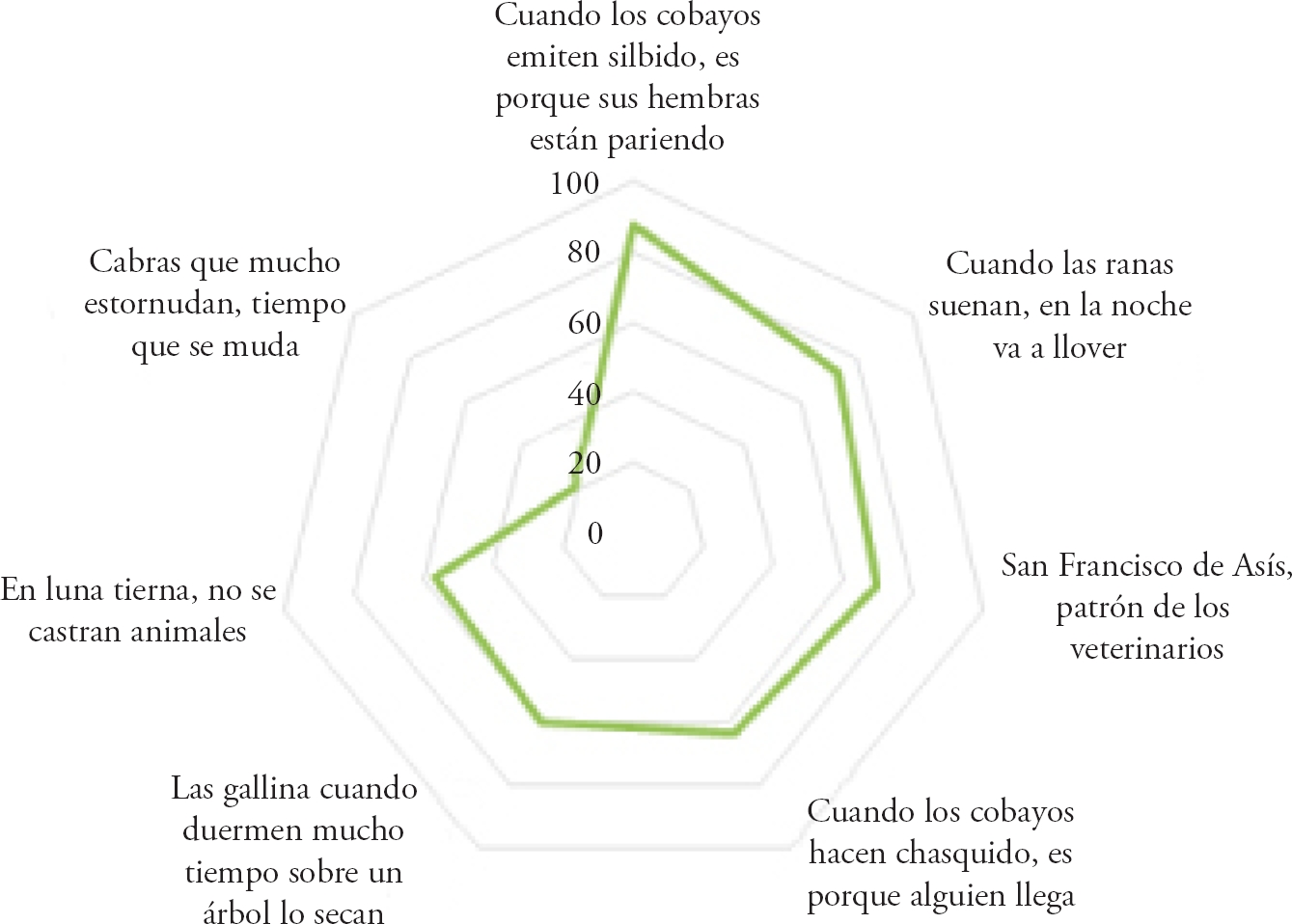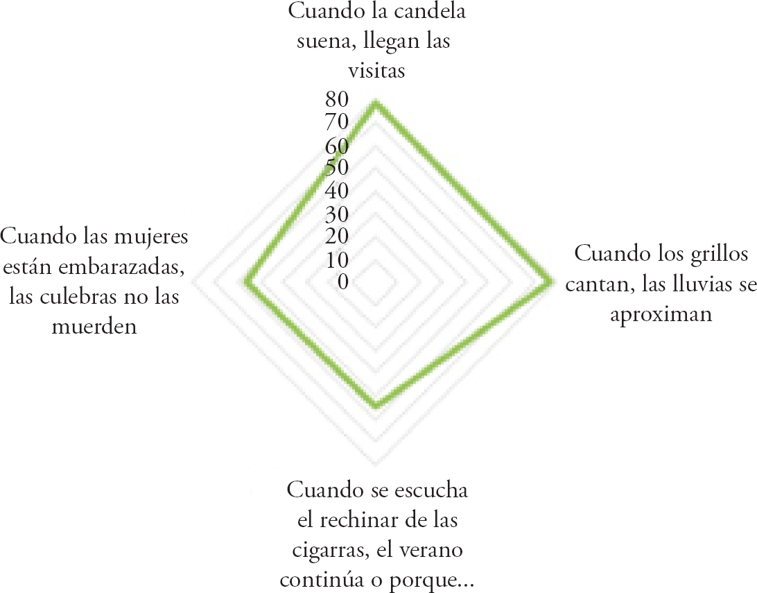 De los encuestados 92%, consideró que los dichos, son importantes y que deberían ser conocidos tanto por profesionales y técnicos del sector agropecuario. No obstante, no se observaron diferencias significativas según la edad (χ2=3.256, p=0.776), género % (χ2=4.738, p=0.094) y nivel de educación (χ2=4.589, p=0.598). En el Figura 2, se muestran los principales dichos mencionados por las personas encuestadas.