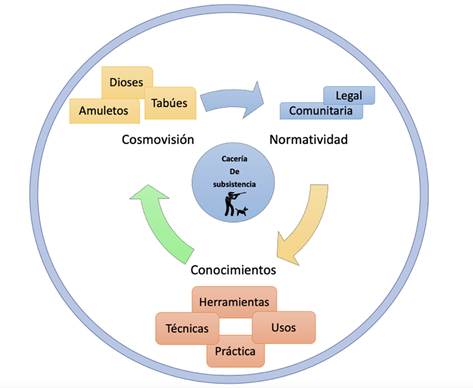 La cacería es una de las actividades más antiguas y una de las principales formas de subsistencia reconocidas en diversas comunidades rurales en toda América Latina (Briceño 2016). En el caso de la cacería de subsistencia, como su nombre lo alude, su propósito básico es el beneficio alimenticio (Galindo 2012), ya que en la mayoría de los casos el cazador es de bajos recursos económicos, y la obtención de carne silvestre representa el sustento propio (Valencia 2019), de la familia y en ocasiones de su comunidad. Sin embargo, aun siendo un elemento alimenticio el principal motivo de la caza, la actividad no debe reducirse únicamente al hecho de satisfacer dicha necesidad, ya que implica una situación más compleja que encierra cultura, cosmovisión, convivencia social e incluso diversión entre amigos (Herrera-Flores 2016). La confluencia de dichos elementos contribuyen a la vez a mantener un lazo con la comunidad (Rodríguez-Valencia 2010) y con el territorio mismo, manifestando el tipo de visión del mundo o cosmovisión de un grupo étnico (Santos-Fita 2013) a partir de usos, conocimientos, normas, métodos, herramientas, creencias, ceremonias, experiencias, habilidades y valores, entre otros aspectos que integran el proceso de la caza (Figura 1) y que son transmitidos, de generación en generación, como actividad primordialmente masculina (Godínez y Vázquez 2003; Ramírez y Naranjo 2007; Galindo 2012; Plata 2017), aunque no exclusivamente.