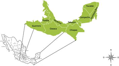 La región Sur Sureste de México (Figura 2) está conformada por los estados de Campeche, Chiapas, Guerrero, Oaxaca, Puebla,7 Quintana Roo, Tabasco, Veracruz y Yucatán (Arriaga et al. 2000). Esta región posee gran riqueza e importancia ambiental, cultural y lingüística; un claro ejemplo son los estados de Chiapas, Oaxaca, Veracruz, Puebla y Yucatán, que cuentan con el mayor número de hablantes de lenguas indígenas a nivel nacional (INEGI 2020), además de que los tres primeros también se encuentran entre los estados con mayor diversidad natural a nivel nacional y presencia de pueblos indígenas (Boege 2008).