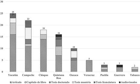 Se identificaron 96 trabajos de investigación:8 57 artículos científicos, 13 capítulos de libros, 5 tesis de doctorado, 12 tesis de maestría, 7 de licenciatura y 2 documentos audiovisuales (Figura 3). La mayor parte de los estudios sobre cacería de subsistencia se encuentran en el estado de Yucatán (25), seguido por Campeche (22), Chiapas (18) y Quintana Roo (16). Cabe mencionar que seis de estos trabajos (artículos, capítulo de libro, tesis de licenciatura y doctorado) fueron realizados en dos y hasta en tres estados distintos.