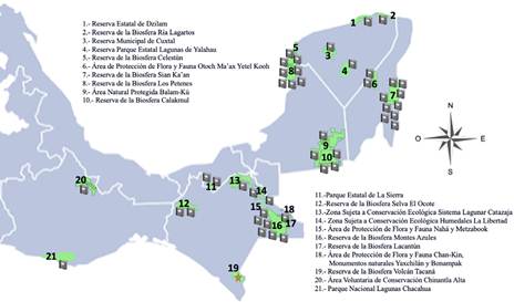 Tomando en cuenta todo lo anterior, es preciso señalar que se documentaron 44 trabajos realizados en zonas de influencia de ANP de la región Sur Sureste de México (Figura 4),10 representando 45 % del total de investigaciones recabadas (96), ubicadas en su mayoría en el estado de Campeche (13), seguido por Chiapas (12), Quintana Roo (9), Yucatán (6), Oaxaca (2) y Tabasco (2); descartando a los estados de Veracruz, Guerrero y Puebla por no contar con investigaciones realizadas en ANP. Las categorías de las ANP en las que se ubican dichas investigaciones son: Reserva de la biosfera (Chiapas, Campeche, Quintana Roo y Yucatán), parque nacional o estatal (Oaxaca y Tabasco), monumento natural (Chiapas), área de protección de flora y fauna (Quintana Roo y Chiapas), zona sujeta a conservación ecológica (Chiapas) y área destinada voluntariamente a la conservación (Oaxaca).