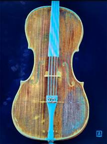 Las siguientes fotografías son del cello en su estado actual, así como el proceso de la realización de la TC (Figura 3), las reconstrucciones tridimensionales también ponen en evidencia el estado del barniz más evidentemente deteriorado en toda la porción izquierda por haber sido tocado primordialmente por chelistas diestros (Figuras 4 a 6).