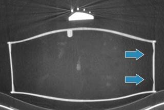Figura 5: Imagen axial del cello. Las flechas azules muestran el desgaste y zonas de adelgazamiento parietal interno.