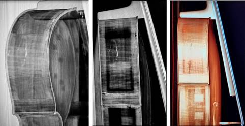 La estructura hueca de un buen número de instrumentos musicales, especialmente los de cuerda al estar elaborados con madera, los hacen ideales para su estudio mediante herramientas de imagen seccional, como lo es la tomografía computada. La relativa baja cantidad de elementos metálicos (que provocan artificios electrónicos, como el hard beaming) no generan degradación de la imagen, pudiendo obtener con precisión el grosor parietal, así como posibles rajaduras o zona de fracturas que no han involucrado la cara visible del instrumento. Las posibilidades actuales para la obtención de imágenes volumétricas tridimensionales, así como la asignación de mapas de colores con base en la densidad y la posibilidad de la navegación virtual, podrán ser, sin la menor duda, de gran ayuda para la valoración integral de dichos instrumentos musicales. Es relevante mencionar que, tanto en Alemania como en Austria, desde 1988 existe un proyecto para el estudio de los instrumentos antiguos a través de la TC.4