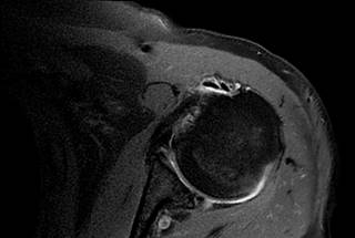 Figura 1: Resonancia magnética de hombro izquierdo en adquisición axial T2 con saturación grasa donde se observa el origen a nivel de la cabeza del húmero del tendón de la porción larga del bíceps.