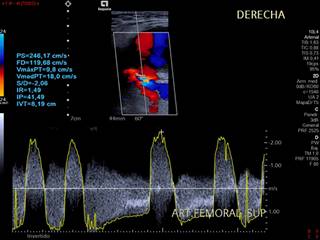 Figura 1: Doppler espectral del sitio de comunicación del pseudoaneurisma en donde se visualiza fenómeno de aliasing, espectro bifásico equidistante, velocidad picosistólica e índice de resistencia elevado.
