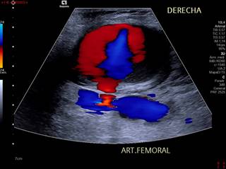 Hombre de 76 años con fibrilación auricular, a quien se le realiza coronariografía diagnóstica con abordaje femoral derecho. Después de ese evento en el postoperatorio se identifica evolución de lesión focal adyacente al sitio de punción, la cual era dolorosa e incrementaba su volumen e induración de forma diaria, por lo que se solicita ultrasonido Doppler de miembro inferior derecho para su valoración encontrándose pseudoaneurisma de la arteria femoral derecha (Figuras 1 y 2).