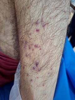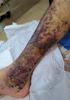 Figura 2: Placa purpúrica en pierna derecha y área ulcerada en región de maléolo interno derecho cubierta por costras melicéricas.