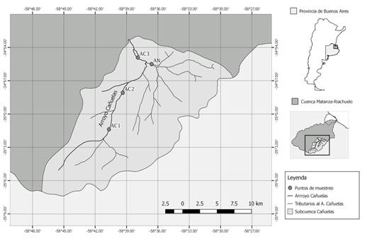 El arroyo Cañuelas está en la provincia de Buenos Aires, Argentina, en el partido homónimo. Este arroyo es tributario del río Matanza Riachuelo; posee un caudal medio de 1.52 m³s-1 y su cuenca cubre una superficie de 368.311 km2. Para su estudio, se establecieron cuatro puntos de muestreo de agua superficial. El punto AC1 (S 35° 1’ 23”; W 58° 40’ 43”) es el más cercano a la naciente del arroyo; posee un caudal medio de 0.17 m3s-1, y se emplaza en una zona de uso agrícola-ganadero con industrias mayormente dedicadas al procesamiento de productos cárnicos y sus subproductos (ACUMAR, 2016). El punto AC2 (S 34° 58’ 5”; W 58° 39’ 24”), ubicado 6.6 km río abajo del punto AC1, localiza en un área periurbana, con pequeños barrios residenciales. El punto AN (S 34° 55’ 30”; W 58° 36’ 37”) se localiza sobre el arroyo Navarrete, que posee un caudal medio de 0.39 m3s-1 y confluye con el A. Cañuelas a 6.7 km río abajo del punto AC2. En las cercanías de este arroyo se localizan urbanizaciones que en algunas zonas carecen de servicios sanitarios, además de barrios residenciales privados y pequeñas industrias dispersas que descargan efluentes al arroyo. Finalmente, el punto AC3 (S 34° 54’ 54”; W 58° 37’ 56”) se encuentra en un área residencial a 1.5 km río abajo del punto de confluencia de ambos arroyos, en donde alcanza un caudal promedio de 1.52 m3s-1 (ACUMAR, 2018). La Figura 1 ilustra la posición de los puntos de muestreo en el área de estudio dentro de la subcuenca del A. Cañuelas.