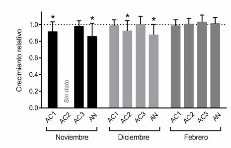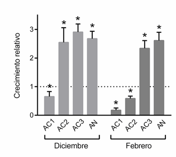 En la Figura 2 se presentan los resultados del bioensayo realizado con P. subcapitata. En el 63 % de las muestras analizadas se obtuvo una sobreestimulación significativa (ANOVA, p < 0.05) del crecimiento relativo: 2.48 (AC2), 2.91 (AC3) y 2.55 (AN) para el mes de diciembre, y 2.34 (AC3) y 2.61 (AN) en febrero. Sin embargo, se observó una inhibición significativa (p < 0.05) del crecimiento en el punto AC1 (0.65) en el mes de diciembre, y en los puntos AC1 (0.18) y AC2 (0.59) en febrero.
