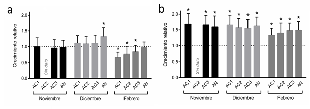 Respecto a la elongación de la raíz (Figura 3a), en el mes de noviembre se determinaron valores de crecimiento relativos cercanos al control en las muestras de agua recolectadas en los sitios AC1 (1.00), AC3 (0.95) y AN (0.98). Contrariamente, los valores de crecimiento relativo de la elongación obtenidos en el mes de diciembre mostraron una sobreestimulación de la raíz en todas las muestras de agua de todos los puntos analizados (1.11 en AC1; 1.09 en AC2; 1.11 en AC3), siendo el punto AN (1.32) donde el crecimiento fue significativamente (p < 0.05) mayor al control. En el mes de febrero, las muestras de agua de tres de los puntos presentaron una inhibición significativa en la elongación de la raíz (0.67 en AC1; 0.76 en AC2, y 0.84 en AC3). Cabe destacar que en este mes tanto la elongación del tallo como la de la raíz registraron los valores más bajos, presentando un aumento gradual del crecimiento en el siguiente orden: AC1 < AC2 < AC3 < AN.