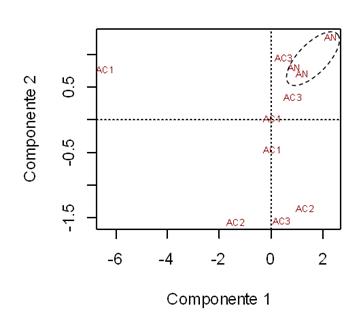 En la Figura 5 se presenta el ACP donde el primer componente (CP1) se lleva el 60 % de la variabilidad de los datos, mientras que CP1 y CP2 conjuntamente reúnen el 73 % de la variabilidad total. En el cuadrante positivo tanto de la CP1 como de la CP2 se puede observar que los puntos de muestreo de AN se encuentran agrupados, lo cual indica una alta homogeneidad entre los valores de los parámetros fisicoquímicos de esas muestras. Es así como en estas muestras extraídas en AN, en comparación con las demás, predominan las concentraciones más altas de OD, PT y N-NO3 - y los menores valores de CE. Por otra parte, las muestras de los puntos AC1 y AC2 presentan una mayor dispersión en el eje de la CP1; mientras que en las muestras de AC3, su dispersión se manifiesta a lo largo de la CP2. Puntualmente, las muestras de AC1 y de AC2 (muestreo de febrero) se hallaron en el eje negativo de la CP1, descritas por un valor muy bajo de OD, y valores altos de DQO y DBO. Respecto de la CP2, el parámetro que permitió diferenciar las muestras fue el NTK, hallándose en el eje negativo aquellas muestras que presentaron un mayor valor de este parámetro.