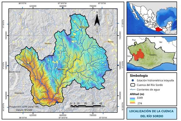 La cuenca del río Sordo se localiza en el estado de Oaxaca, entre los paralelos 17° 37’ 19.93” y 16° 29’ 43.11’’ de latitud norte, y los meridianos 98° 05’ 54.34” y 96° 53’ 17.86” de longitud oeste. Cuenta con una altitud que va desde los 274 msnm hasta los 3 349 msnm, y comprende una superficie de 7 751.42 km2, en la que confluyen varios ríos; los más importantes por su dimensión son Peñoles, Labor, Cuchara, Zapote, Yolotepec y Sordo. El río Sordo-Yolotepec desemboca en la estación hidrométrica Ixtlayutla (20021) (Figura 1).