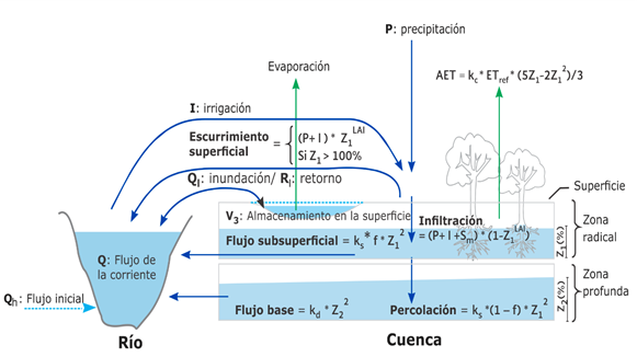 En WEAP, la cuenca puede ser dividida en subcuencas, las cuales, a su vez, pueden ser divididas en N áreas con diferentes cubiertas vegetales j. El balance de agua en la zona radicular y en la zona profunda se calculan por tipo de cobertura con la Ecuación (1) y Ecuación (2), respectivamente (Yates et al., 2005):