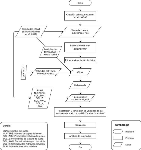 La metodología empleada para la alimentación de WEAP se muestra en la Figura 3. Los datos generados en SWAT para las unidades de respuesta hidrológica (HRU por sus siglas en inglés) de la cuenca del río Sordo calibrados por Sánchez-Galindo et al. (2017) se incorporaron, previa ponderación entre superficies y conversión de unidades, a las áreas (branches) con que opera WEAP.
