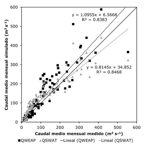 Figura 5 Relación entre caudales medios mensuales observados y simulados con SWAT y WEAP en la cuenca del río Sordo.