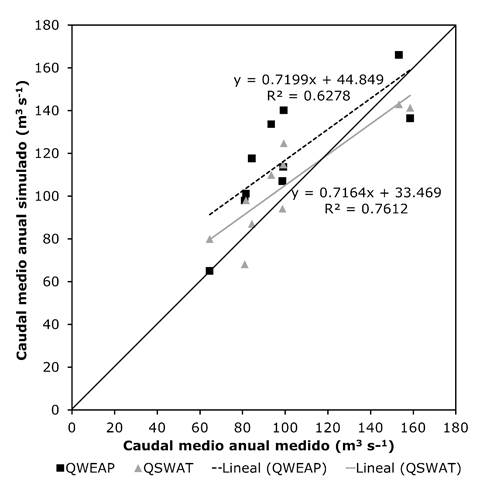 Los caudales medios anuales simulados en WEAP alcanzaron un NSE = 0.3 al compararse con los valores observados en la estación hidrométrica, resultando un ajuste “insatisfactorio” (Moriasi et al., 2007), sobre todo por el efecto de los años 1977, 1979 y 1980 (Figura 6). Por su parte, SWAT alcanzó un mejor ajuste con un NSE = 0.73 “bueno” y un PBIAS = -4.6, es decir sólo sobreestimó en un 4.6 %. Algo semejante ocurrió con los valores de r2: WEAP obtuvo 0.63 mientras que SWAT logró 0.76 (Figura 7).