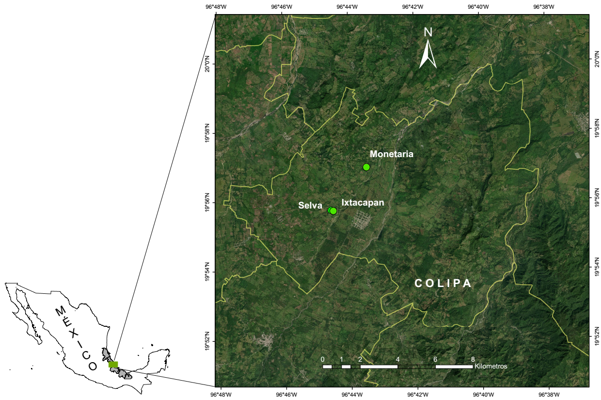 Figura 1 Sitios de estudio en el municipio de Colipa en Veracruz. En Ixtacapan se observan dos círculos verdes, uno corresponde al fragmento de selva alta perennifolia y el otro al cafetal abandonado (separados por 5 m). El Cafetal La Monetaria se localiza a 3 km de Ixtacapan.