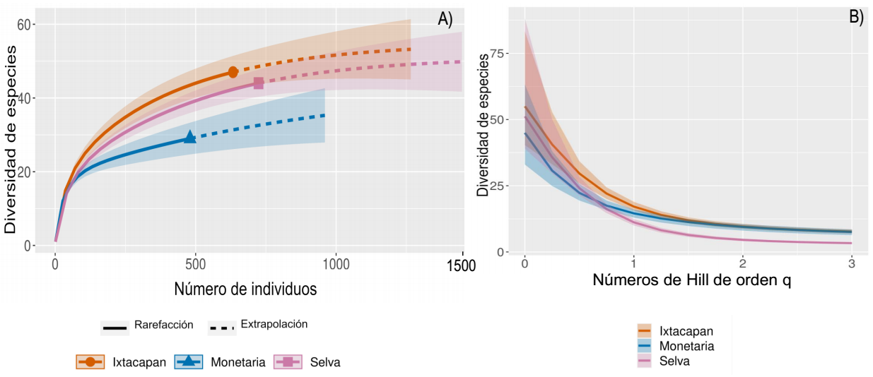 Figura 2 A) Ajuste curvilineo para la rarefacción de la diversidad de especies en la comparativa de los tres sitios: Ixtacapan, Monetaria y SAP. Se muestra las bandas de intervalo de confianza al 95 % y las líneas punteadas indican la tendencia que seguiría si se aumenta el muestreo. B) Ajuste de la diversidad de especies, estimada de acuerdo con el método de Hill (q0, q1, q2, q3) en las tres comunidades vegetales estudiadas.