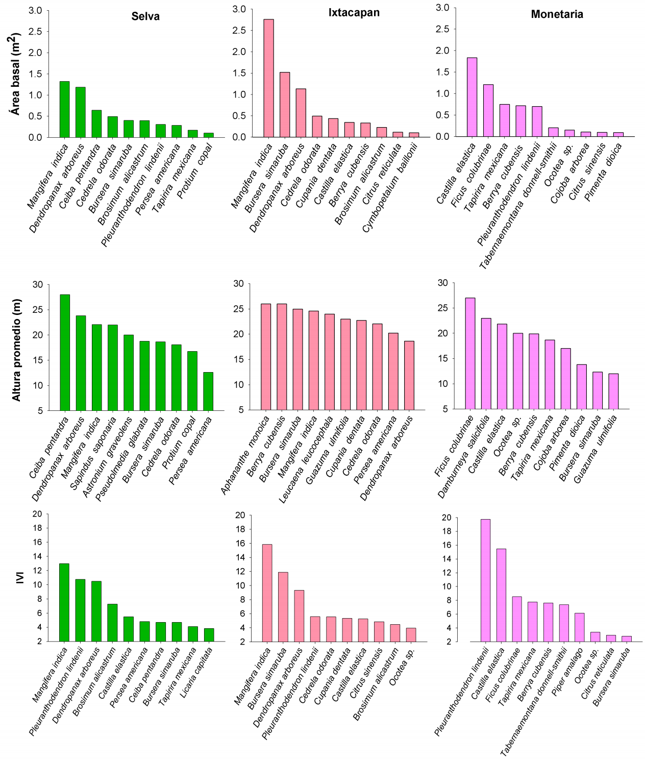 Figura 3 En el dosel, las diez especies arboreas con los valores más altos de área basal, altura y dominancia según el Índice de Valor de Importancia (IVI) en fragmento de SAP (selva), cafetal IX (Ixtacapan) y cafetal LM (Monetaria).