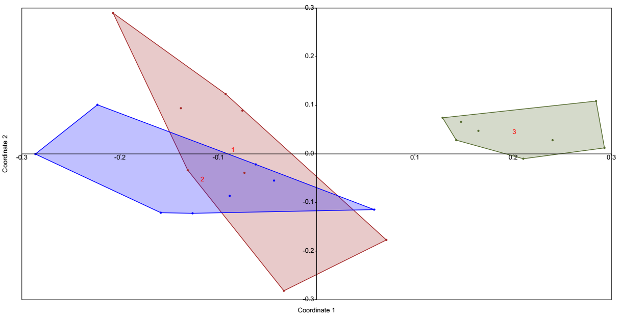 Figura 4 Recambio de especies entre sitios estimados con NMDS. En la Figura 1 de color rojo corresponde a la selva alta perennifolia, la Figura 2 de color azul corresponde al cafetal de Ixtacapan (se puede observar como parte de las figuras se traslapan) y Figura 3 de color gris que corresponde al cafetal La Monetaria.