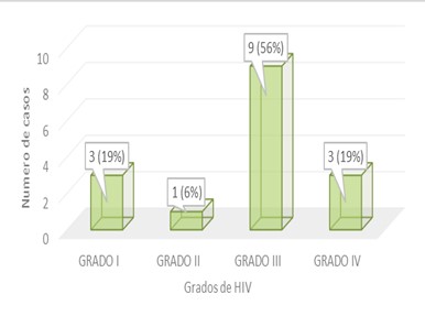 En la severidad de la hemorragia interventricular según la escala de Papile se distribuyeron de la siguiente manera, grado I: 3 (19%), grado II: 1(6%), grado III: 9 (56%), grado IV: 3 (19%) como se observa en la Figura 1.