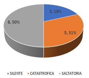 La presentación clínica que predominó fue la saltatoria en 8 casos (50%), seguida por la catastrófica 5 casos (31%) y la silente en 3 casos (19%) como se puede observar en la figura 2.