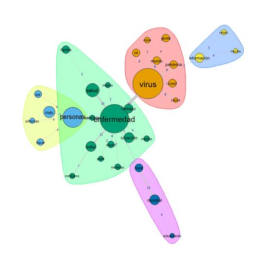 Finalmente, en la figura 2 se observa cómo se organizan las razones de las palabras asociadas después de la emergencia internacional. De igual forma al gráfico anterior, a partir de las frecuencias y las coocurrencias de las evocaciones se muestran cuatro nodos representacionales, en donde al centro figura enfermedad que se encuentra en el nodo color rojo con otras palabras como virus, mundo y debido. La palabra de enfermedad presenta una coocurrencia mayor con covid que, junto a cuarentena, se presentan en el nodo color azul. Pandemia forma con más y casa el nodo color morado, mientras que personas junto a forma se organizan en un último nodo de color verde.