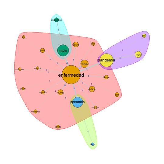 En la tabla 1 se muestran las evocaciones más frecuentes a partir de los listados libres aplicados durante la pandemia. Se presentan aquellas que se mencionaron al menos cinco ocasiones, lo que dejo un total de 22 palabras que representan el 51.16% de las evocaciones totales. Los términos mayormente reportados fueron virus, enfermedad y pandemia; mientras que aquellos que se asociaron con menos frecuencia fueron precaución, coronavirus, fiebre, riesgo y caos.