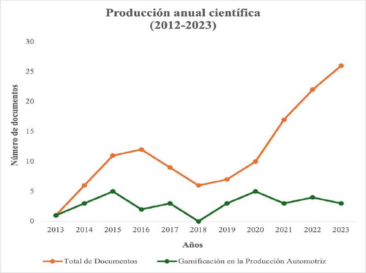 El estudio bibliométrico extraído de la aplicación Bibliometrix sobre los parámetros más relevantes comparando el total de documentos (135) con los seleccionados por la evaluación cualitativa (37) muestra una tendencia creciente en la producción anual científica sobre los temas de gamificación en los entornos de producción (Gráfica 1). Con base al periodo del criterio de búsqueda, se omiten de la gráfica mencionada los datos de los documentos acumulados hasta el mes de abril del año 2024, por considerarlos no relevantes en la tendencia global (7 para el total de documentos y 4 para en enfoque al sector automotriz).
