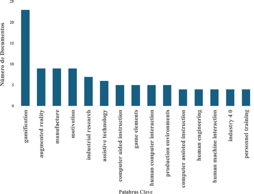 Finalmente, se realizó un análisis de las ocurrencias sobre las palabras clave de los autores que han realizado publicaciones respecto a la gamificación enfocado al sector automotriz, por lo que se extrajeron las 15 posiciones más relevantes (Gráfica 2).