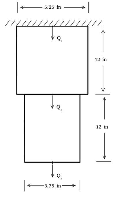En el siguiente ejemplo se consideran dos placas metálicas en donde se aplican operaciones básicas con matrices para obtener la solución. Dichas placas tienen un espesor de t = 1 in., módulo de Young E = 30 X 10⁶ psi y densidad de peso ρ = 0.2836 lb/in³. Además, la placa está sujeta a una fuerza de 100 lb. ¿Encontrar los esfuerzos y la deformación en ellas? [20].