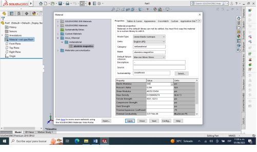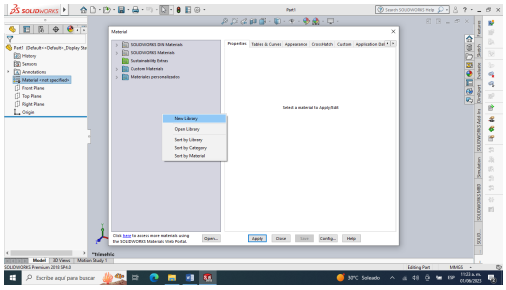 Posteriormente, se procede al siguiente paso, que consiste en la selección de la opción denominada 'Editar material' o 'Edit material' en el caso de la versión en inglés, con el propósito de generar un nuevo material o bien optar por uno previamente existente en la vasta biblioteca de materiales provista por SolidWorks® (ver figura 4).