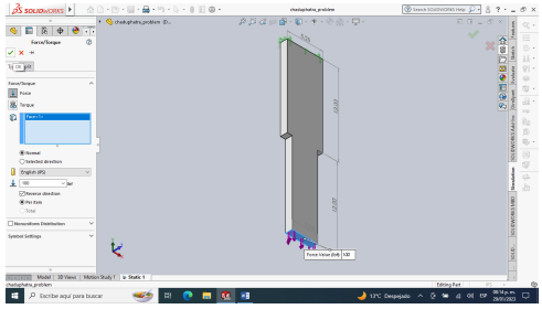 A continuación, haga clic en 'External Loads' o 'Fuerzas externas' y seleccione 'Load' o 'Fuerza', indicando la fuerza requerida y su dirección. Finalmente, haga clic en la parte de la pieza donde desea aplicar la fuerza (ver figura 9).