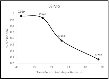 No obstante, a un tamaño nominal de 90.5 µm, se observa una disminución del 47.37 %, lo que subraya la importancia de mantener la mayor cantidad de mineral procesado en un intervalo de tamaños menores a 69 µm para evitar pérdidas significativas de molibdeno. Según lo reportado por Wang, los tamaños de partícula óptimos son aquellos que permiten una mayor liberación y se encuentran dentro de los rangos recomendados para la flotación polimetálica [42]. En este estudio, basado en la figura 10, el intervalo que cumple con estas características es <45.5 µm y >58 µm, ya que a tamaños menores tienden a formarse lamas que contaminan los concentrados durante la flotación.