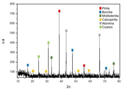 El DRX se utilizó únicamente para corroborar la presencia de molibdenita y determinar los tipos de sulfuros de cobre presentes en el mineral polimetálico, debido a sus diferentes arreglos cristalinos. Para cuantificar los elementos, se empleó el análisis de FRX.