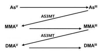 El estudio del metabolismo del arsénico ha cambiado por completo el panorama del impacto de este contaminante en el cuerpo humano, ya que los metabolitos metilados que se generan pueden tener un mecanismo tóxico diferente al del Asi. Este proceso de biotransformación ocurre principalmente en al hígado, ya que aquí es donde encuentra mayoritariamente la enzima encargada de la metilación: la arsenito metil-transferasa, o arénico-3 metil-transferasa (AS3MT). De manera general, el arsenito (+3) es metilado por la enzima AS3MT para generar el ácido monometilarsónico (MMA +5). Este último metabolito es reducido para generar el correspondiente monometilado trivalente (MMA +3), el cual a su vez es nuevamente metilado por la AS3MT para dar lugar a la generación del ácido dimetilarsínico (DMA +5), que posteriormente es también reducido a la respectiva especie trivalente (DMA +3) [1], [21]. Este proceso se resume en la Figura 1.