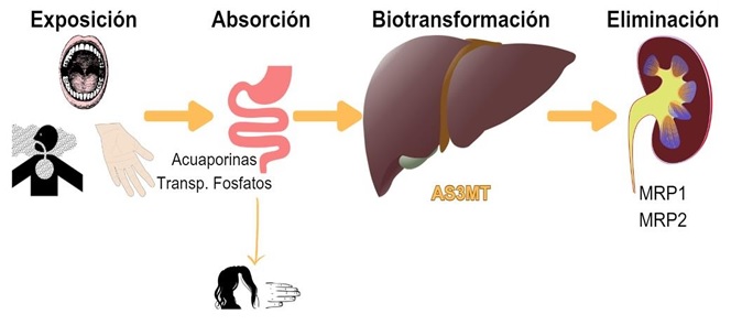 Todas estas especies arsenicales generadas son excretadas a través de unas proteínas denominadas MRP1 y MRP2 (del inglés: Multidrug Resistance Associated Protein 1 y 2). Cerca del 45 % del Asi que ingresa al organismo es eliminado a través de la orina. Los porcentajes restantes pueden acumularse en hígado, cabello, uñas o vejiga, o bien ser excretados a través de la bilis. El DMA es la especie encontrada en mayor proporción en orina (60-80 %) en contraste con MMA y Asi (ambos 5-20 %) [20], [22]. Como se verá a continuación, los cambios en la proporción de esta mezcla de metabolitos en orina pueden ser indicativos de efectos graves en la salud. En la Figura 2 se resume el proceso general de la toxicocinética del arsénico.