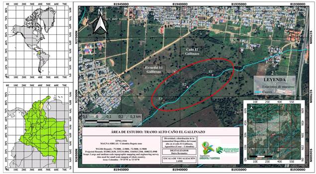 El arroyo El Gallinazo es parte de la microcuenca que lleva el mismo nombre, la cual pertenece a la cuenca de la Quebrada Buturama; este tramo se encuentra dentro de la zona periférica sureste del casco urbano del municipio de Aguachica, Cesar (Figura 1). El tramo alto colinda con un sistema de humedal pantanoso que vierte sus aguas en dicho cauce, las cuales desembocan en el río Magdalena (Saldaña-Escorcia et al. 2022).