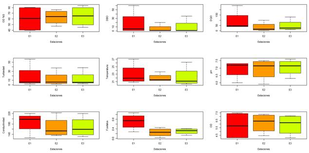 En la Figura 2, se observa que ciertos parámetros presentan datos atípicos, puesto que los bigotes se encuentran fuera del rango intercuartílico, entre estos, DQO, DBO, la conductividad y turbiedad del agua en las estaciones de muestreo, indicando que hay algunas estaciones del año en las que la calidad del agua puede empeorar.