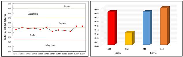 El primer y segundo muestreo (M1, M2) tuvieron un promedio de 0.48 puntos dentro del ICA (Figura 3b), lo que indica mala calidad del agua; mientras que la estación dos (E2) alcanzó un máximo de 0.50 del M1 y en la estación tres (E3) del M2 (Figura 3a). Por otro lado, durante el tercer (M3) y cuarto muestreo (M4) el promedio bajó un punto dentro del rango del ICA (Figura 3a). Durante el periodo de sequía (marzo 2023) se evidenció el valor más bajo (0.42) en la primera estación (E1) de ambos muestreos (Figura 3b). No obstante, en la E2 y E3 del M4 el valor del ICA supero el valor máximo del periodo de lluvia (abril 2023) con 0.53; manteniendo aun así una calificación mala dentro del rango del ICA (Figura 3a).
