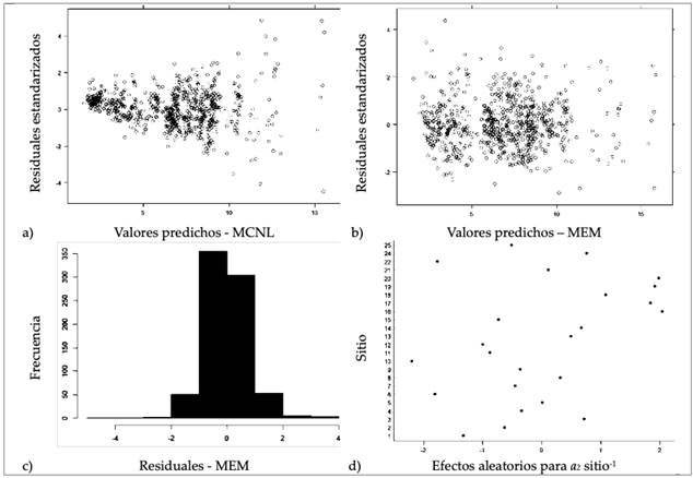 En la Figura 1 se muestra la mejora en la distribución de lo residuales entre el ajuste por MCNL (a) y al incluir la estructura de tipo potencia en los MEM (c) en donde se puede observar que este procedimiento elimina la heteroscedasticidad común de este tipo de ajustes At-d. La prueba gráfica en la frecuencia de los residuos señala el cumplimiento de la normalidad (Figura 1b), mientras que, el valor aleatorio del parámetro 𝑎 2 muestras variabilidad entre sitios (Figura 1d).