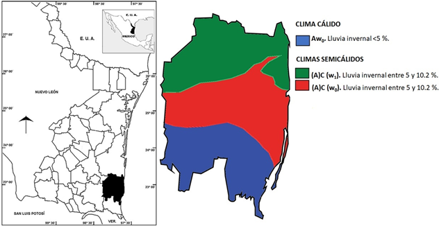 El estudio se realizó en el municipio de Aldama, Tamaulipas (Figura 1), donde participaron productores propietarios de unidades de producción pecuaria (UPP) para la producción de bovinos carne. En el Municipio existen diferentes tipos de clima: cálido (Aw0) y semicálidos subhúmedos [(A)C(w1) y (A)C(w0)] con lluvias en verano (Figura 1).