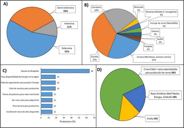 La mayor parte de la ganadería en las UPP de Aldama, Tamaulipas se lleva de manera extensiva (55%, Figura 2A), donde los pastos presentes (Figura 2B) mayormente son estrella de áfrica (Cynodon spp., 35%), seguido de pasto guinea (Megathyrsus spp., 25%) y pasto carretero (Bothriochloa spp., 24%). El 64% de los productores mencionó que la sequía, es la principal problemática que se presenta en el área de forrajes, seguido de la disponibilidad y falta de recursos y capacitación para producir forrajes (19%, Figura 2C). Respecto a los hatos, los principales genotipos que se utilizan son cruzas de ganado cebú con razas especializadas para la producción de carne (66%), seguido de las razas sintéticas (Beefmaster, Brangus y Simbrah, Figura 2D).