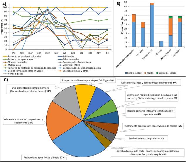 Se observó que el ganado pasta todo el año en las praderas (100%), mientras que en el agostadero es menos frecuente, ya que se presenta entre el 60 y 90% durante el año (Figura 3A). La suplementación y/o complementación con ensilados, concentrados, forrajes de corte, heno, melaza-urea, bloques minerales, sales minerales y vitaminas (ADE), se utilizan principalmente durante la época seca (diciembre-julio; Figura 3A). La mayoría de estos suplementos y/o complementos, los productores los adquieren en la localidad; sin embargo, ante la escasez de forraje, el heno (rollos o pacas) lo tienen que adquirir en la región y dentro del estado (Figura 3B). Respecto a la nutrición e innovaciones adoptadas, en la mayoría de las UPP se proporciona agua fresca y limpia (27%), las vacas se alimentan a base de pastoreo y suplementos (18%) y utilizan alimentación complementaria (concentrados, ensilado, henos); sin embargo, en muy pocas UPP se realiza pastoreo intensivo tecnificado (6%), conservan forraje (5%), establecen praderas (4%) y siembran forrajes de corte, bancos de biomasa o sistemas silvopastoriles para la sequía (4%, Figura 3C).