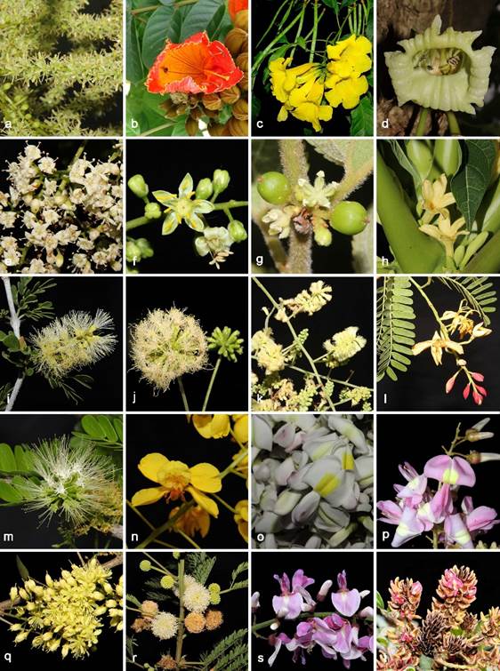 Figura 1 Representación de algunas especies forrajeras presentes en la península de Yucatán. a, Sabal mexicana; b, Spathodea campanulata; c, Tecoma stans; d, Parmentiera aculeata; e, Ehretia tinifolia; f, Bursera simaruba; g, Trema micrantha; h, Carica papaya; i, Ebenopsis ebano; j, Enterolobium cyclocarpum; k, Senegalia gaumeri; l, Tamarindus indica; m, Albizia tomentosa; n, Caesalpinia gaumeri; o, Gliricidia maculata; p, Gliricidia sepium; q, Haematoxylum campechianum; r, Leucaena leucocephala; s, Lonchocarpus castilloi; t, Lonchocarpus rugosus.