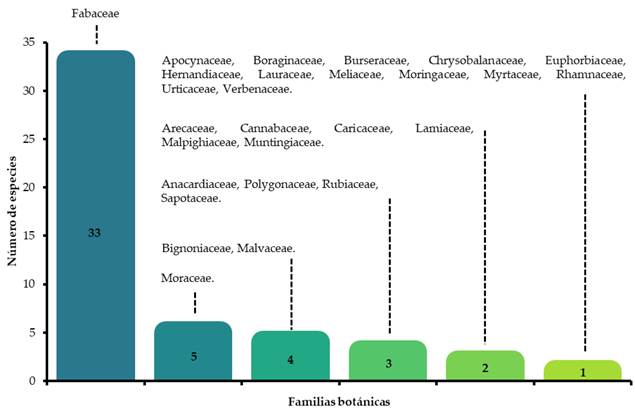 Las EAF identificadas provienen de 27 familias botánicas (Figura 2), destacándose entre estas Fabaceae, ya que representa un 40% de las especies, seguida de Moraceae (6%). Además, las familias Bignoniaceae y Malvaceae contribuyen con un 5% del total de las especies registradas. Otro grupo de familias como Anacardiaceae, Polygonaceae, Rubiaceae y Sapotaceae comprenden el 4% de las EAF. Por otro lado, un cuarto grupo de familias que incluye Arecaceae, Cannabaceae, Caricaceae, Lamiaceae y Malpighiaceae representan el 2%. Las especies restantes se distribuyen en 14 familias adicionales, contribuyen con el 17% de las especies identificadas.