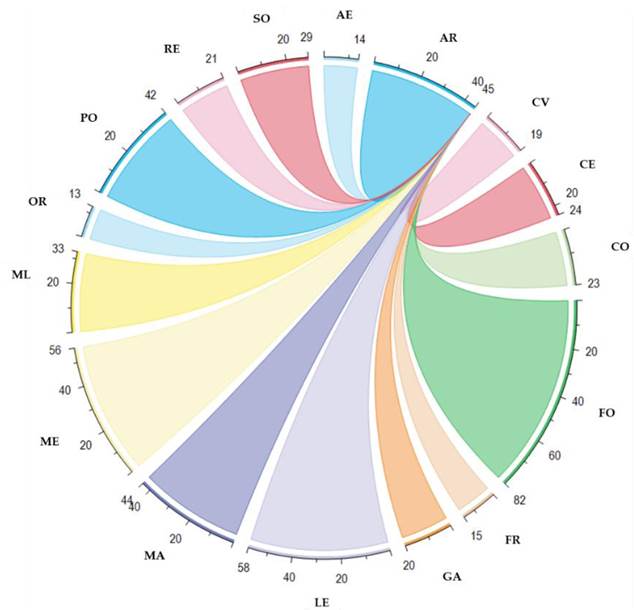 Figura 3 Principales usos de especies arbóreas con potencial forrajero en la Península de Yucatán, México. AE: antiemético. AR: artesanal. CV: cerca viva. CE: ceremonial. CO: construcción. FO: forraje. FR: frutas. GA: gastronomía. LE: leña. MA: madera. ME: medicinal. ML: melífera. OR: ornamental. PO: postes. RE: resina. SO: sombra.