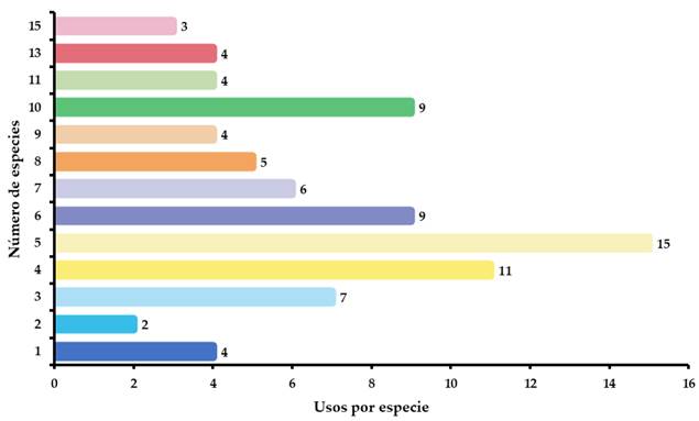 Figura 4 Número de usos atribuidos a las especies arbóreas forrajeras de la Península de Yucatán, México.